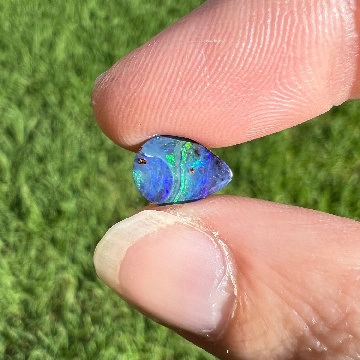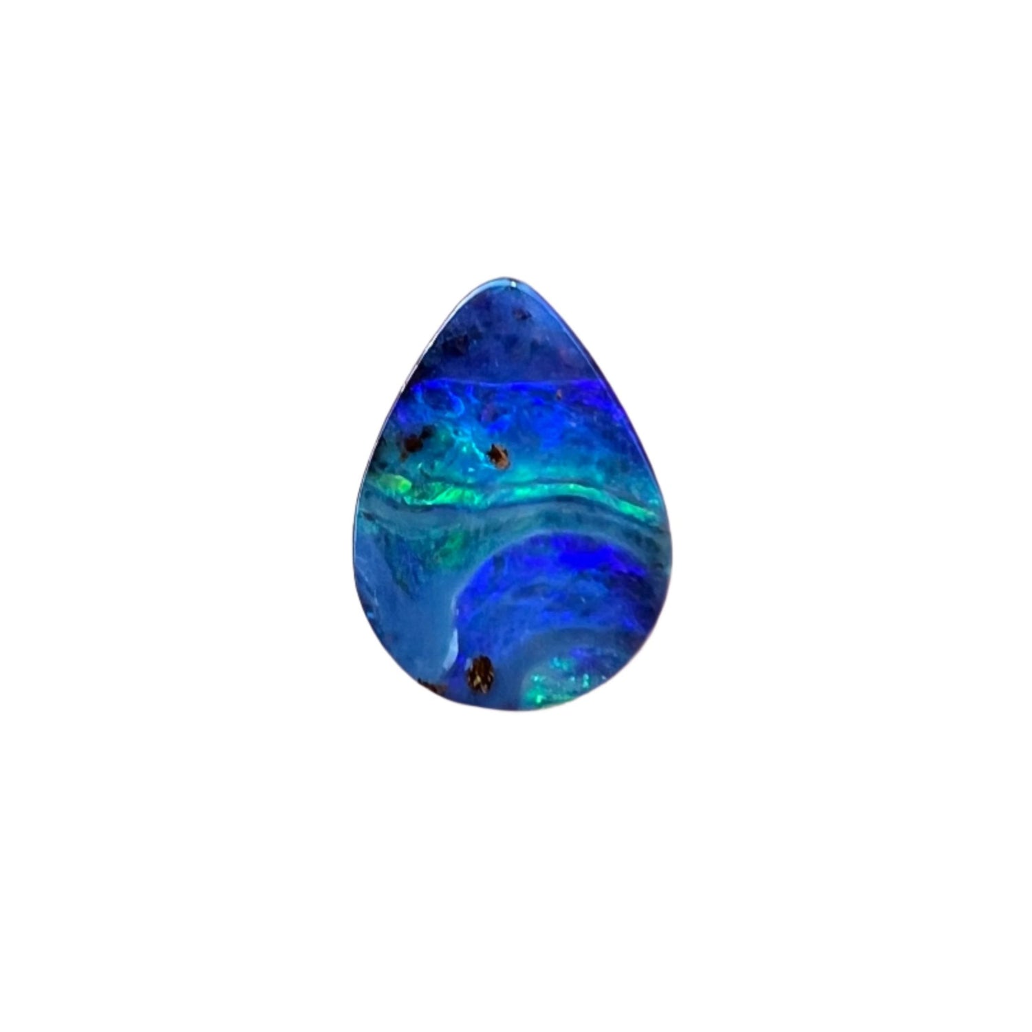 A stunning green and blue boulder opal with a black body-tone.