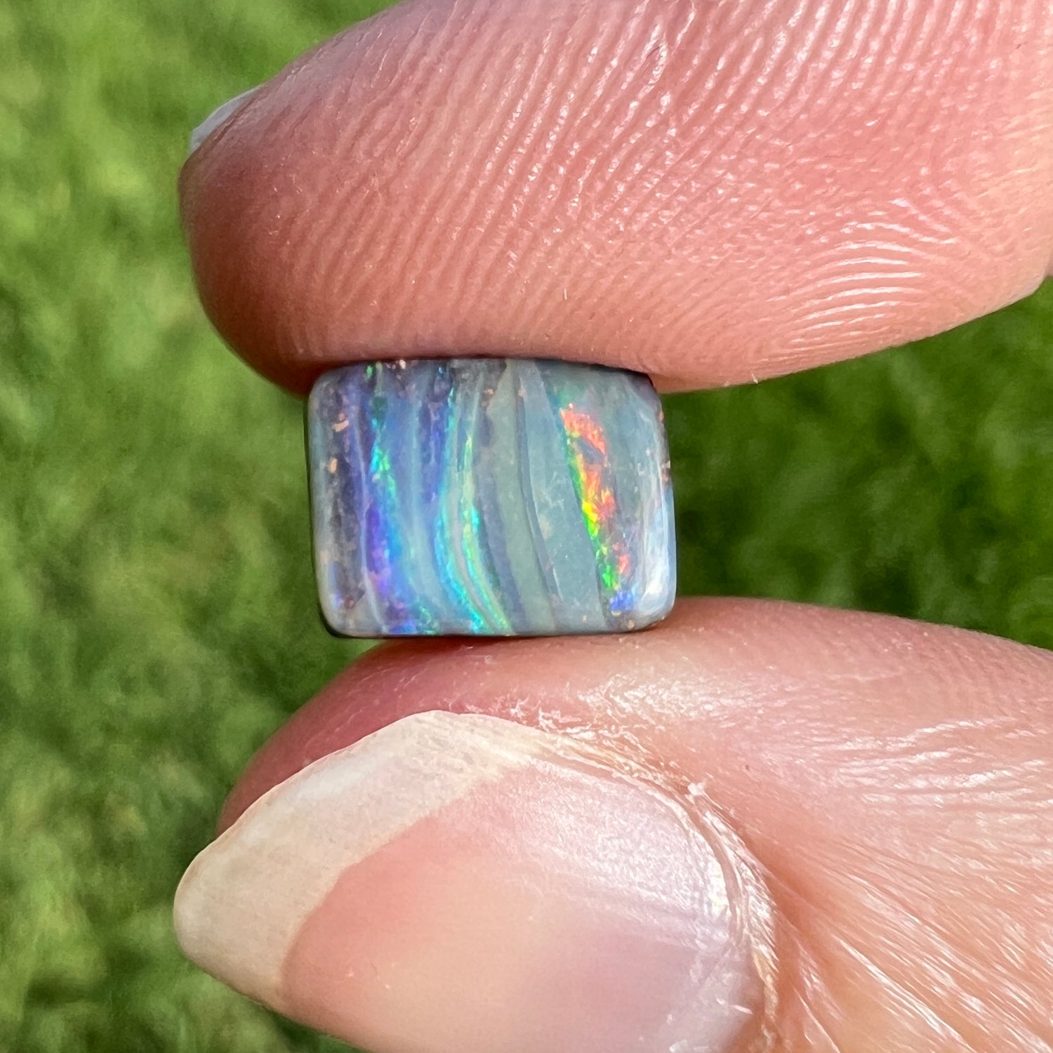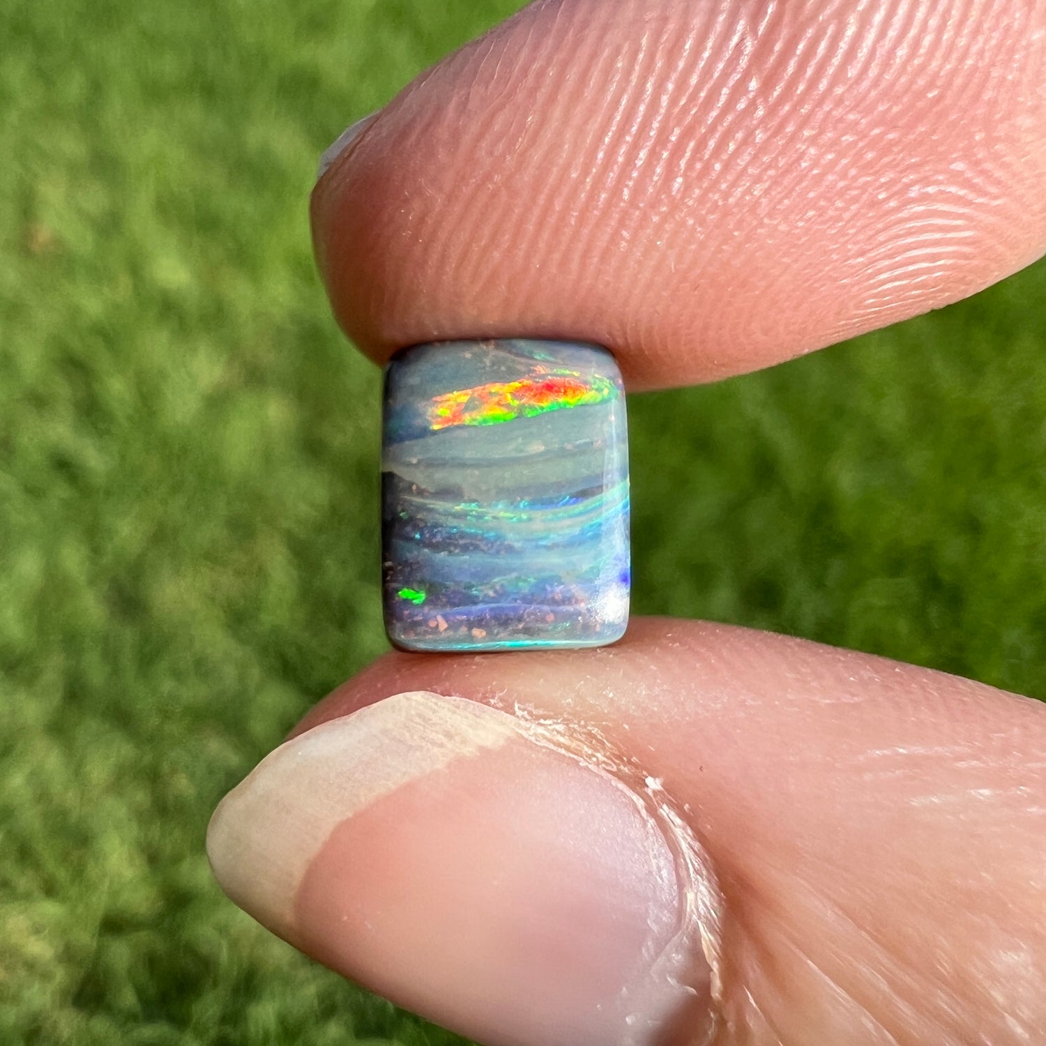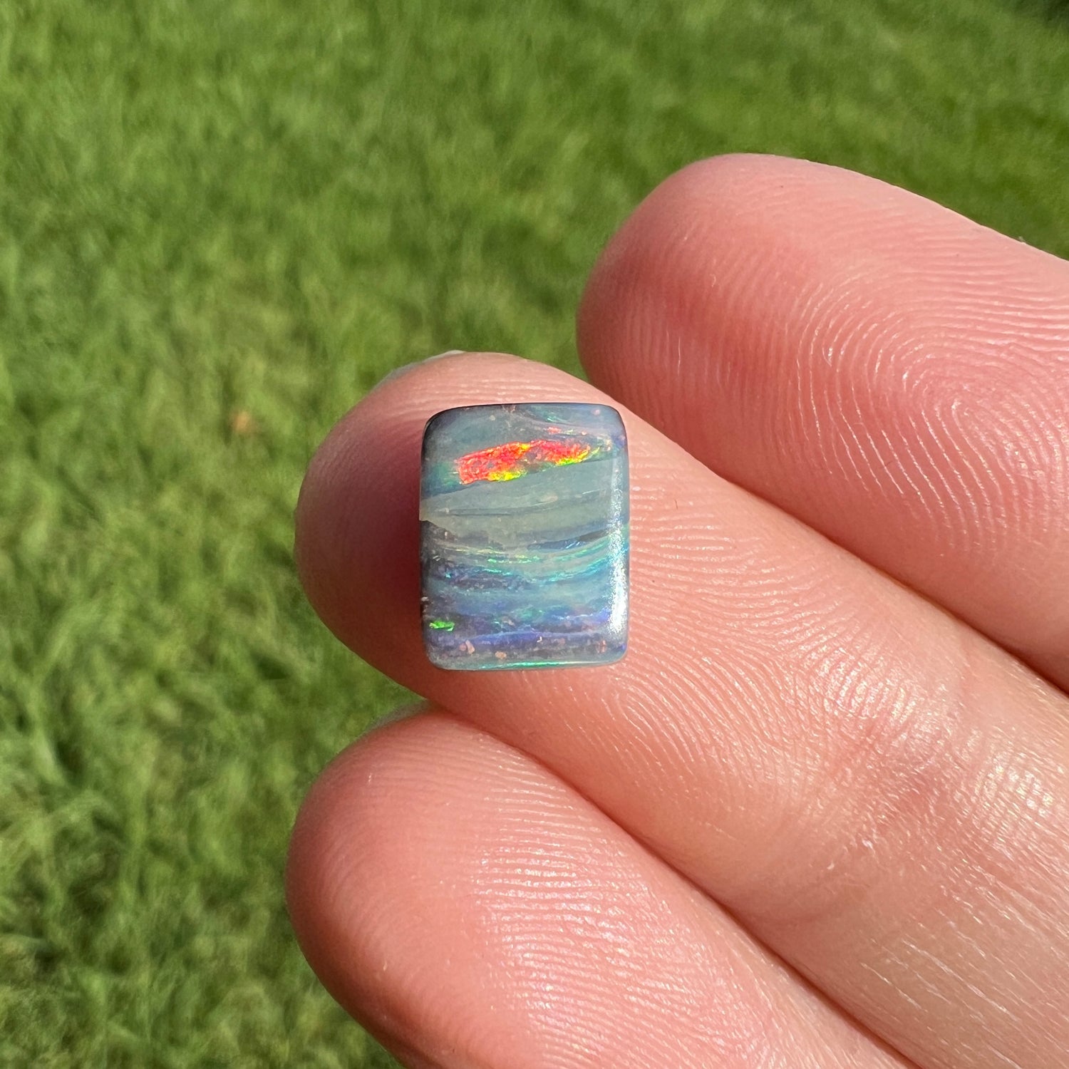 A lovely small rectangle boulder opal with red, green and blue stripes.
