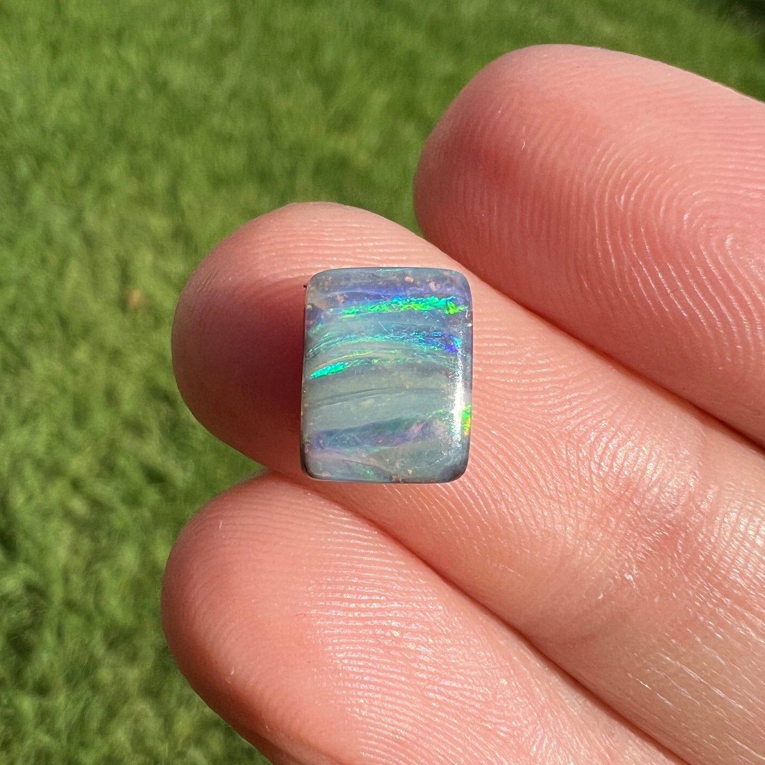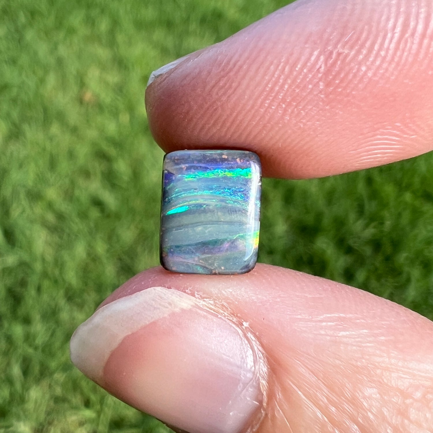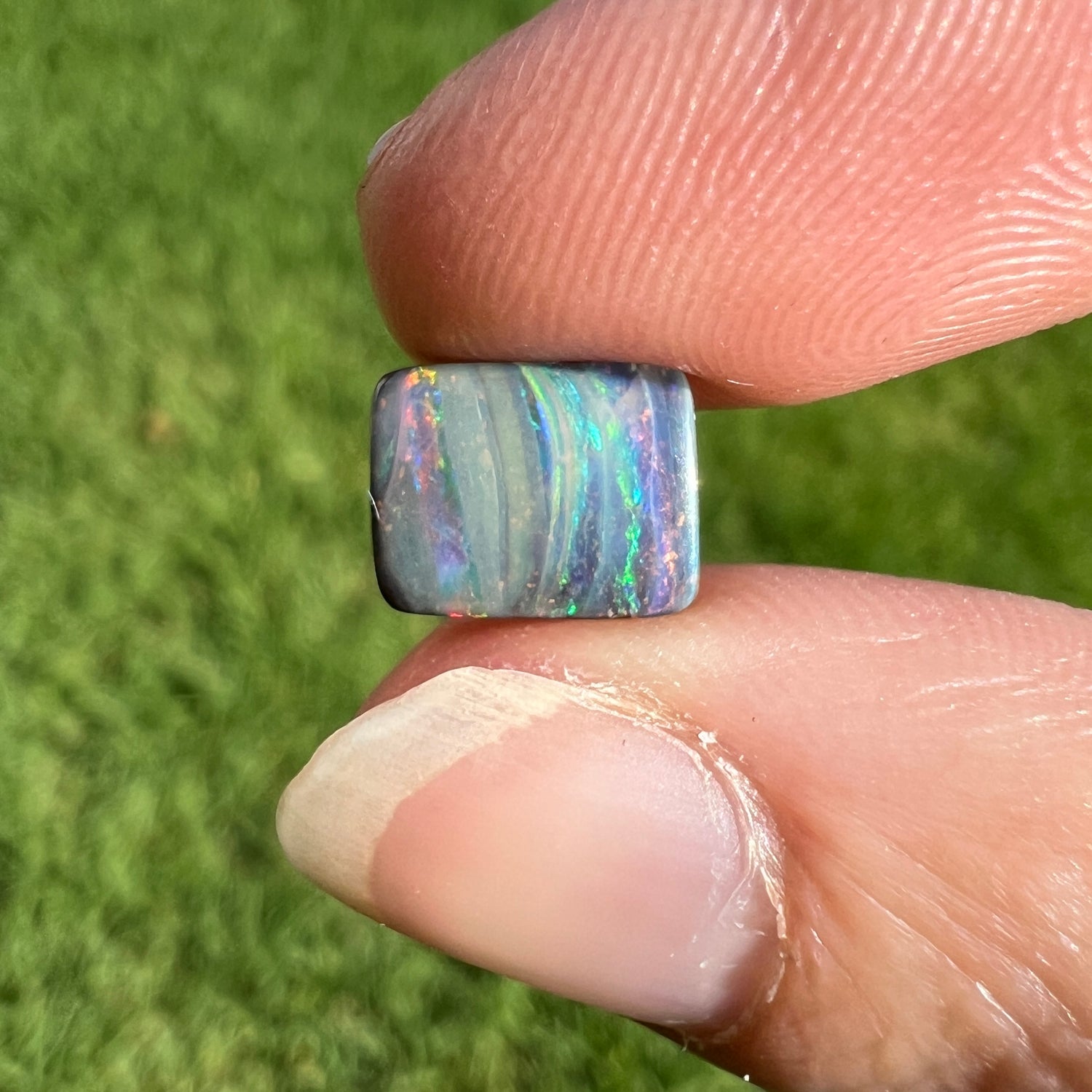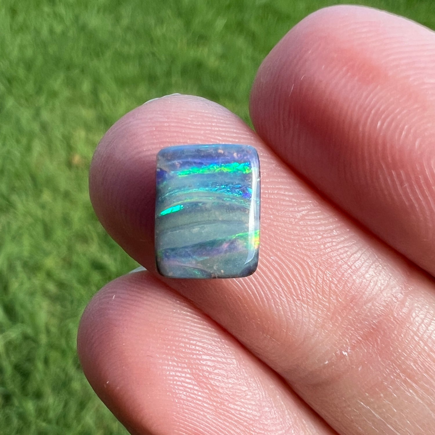A lovely small rectangle boulder opal with red, green and blue stripes.