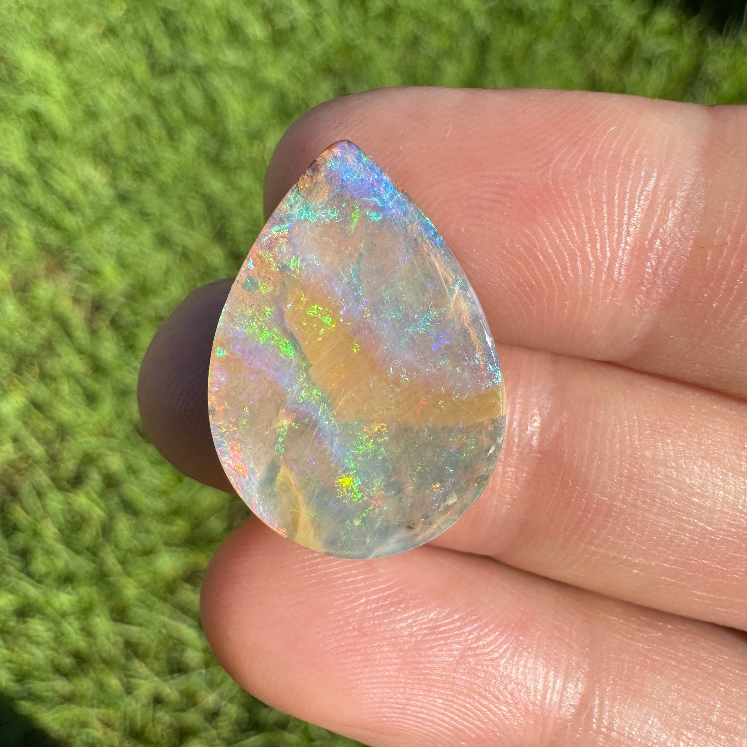 A gorgeous teardrop boulder with greens and purple colours plus caramel stripes.