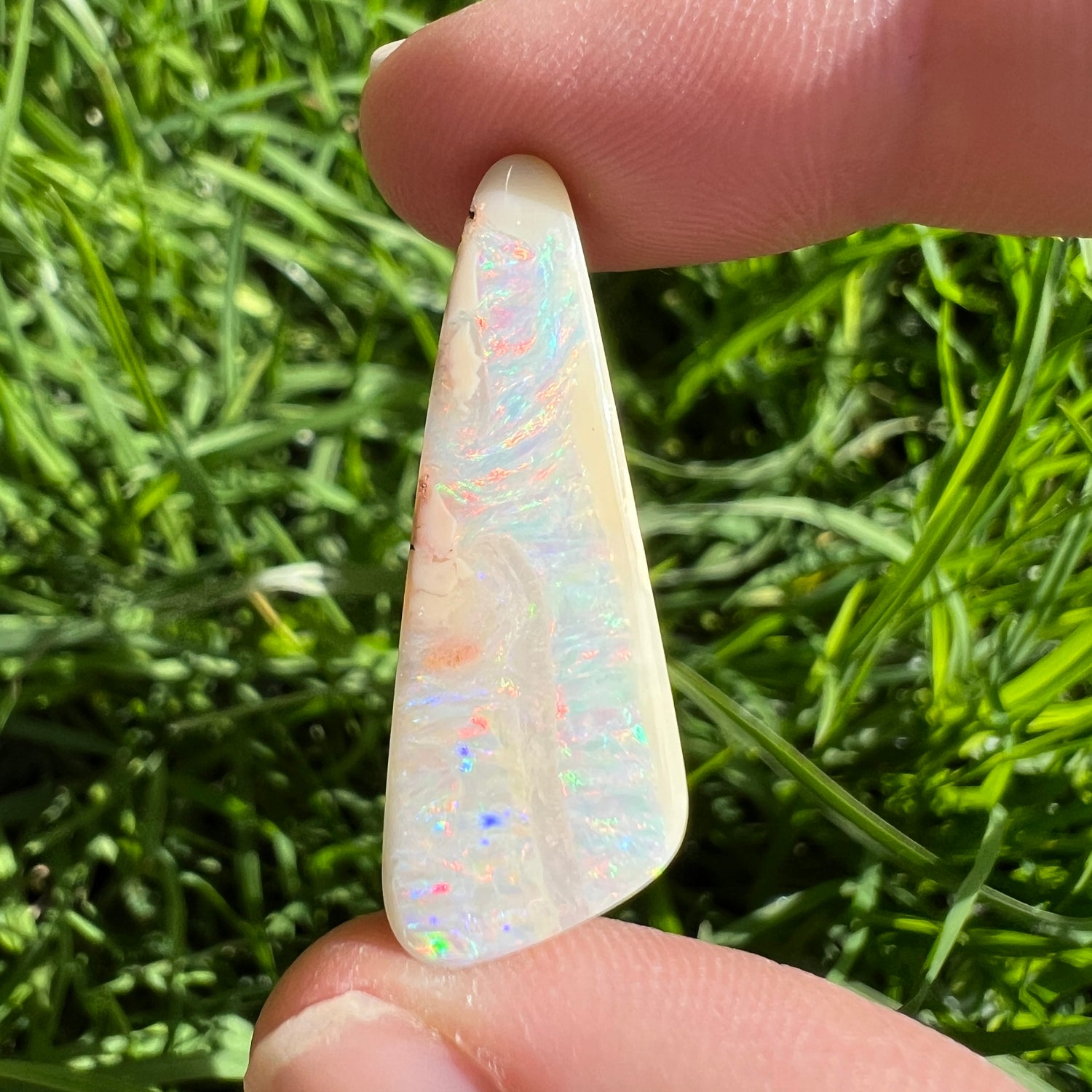 A large, light coloured boulder opal with rainbow colours and swirling off-whites and caramels.