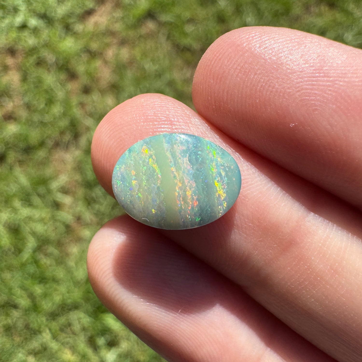 A beautiful stripy rainbow boulder opal with a honey-hued lighter body tone.