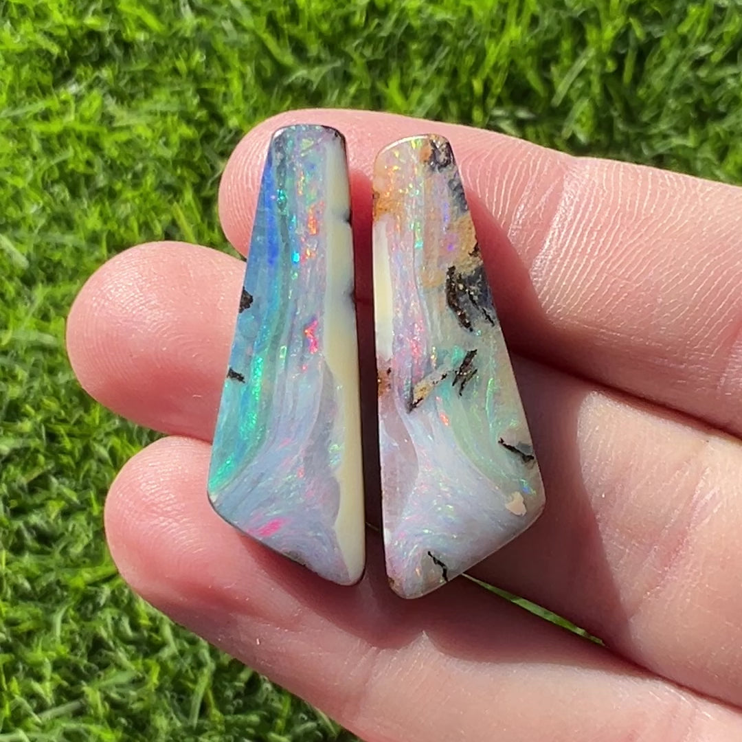 This beautiful 26.60 Ct narrow boulder opal pair is perfect for creating elegant earrings. They features rainbow stripes that create a captivating and unique visual effect.