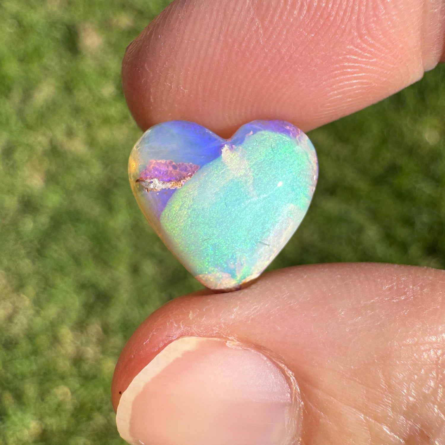 A stunning and rare wood replacement heart boulder opal. The colour combination of green and purple is truely one of a kind.