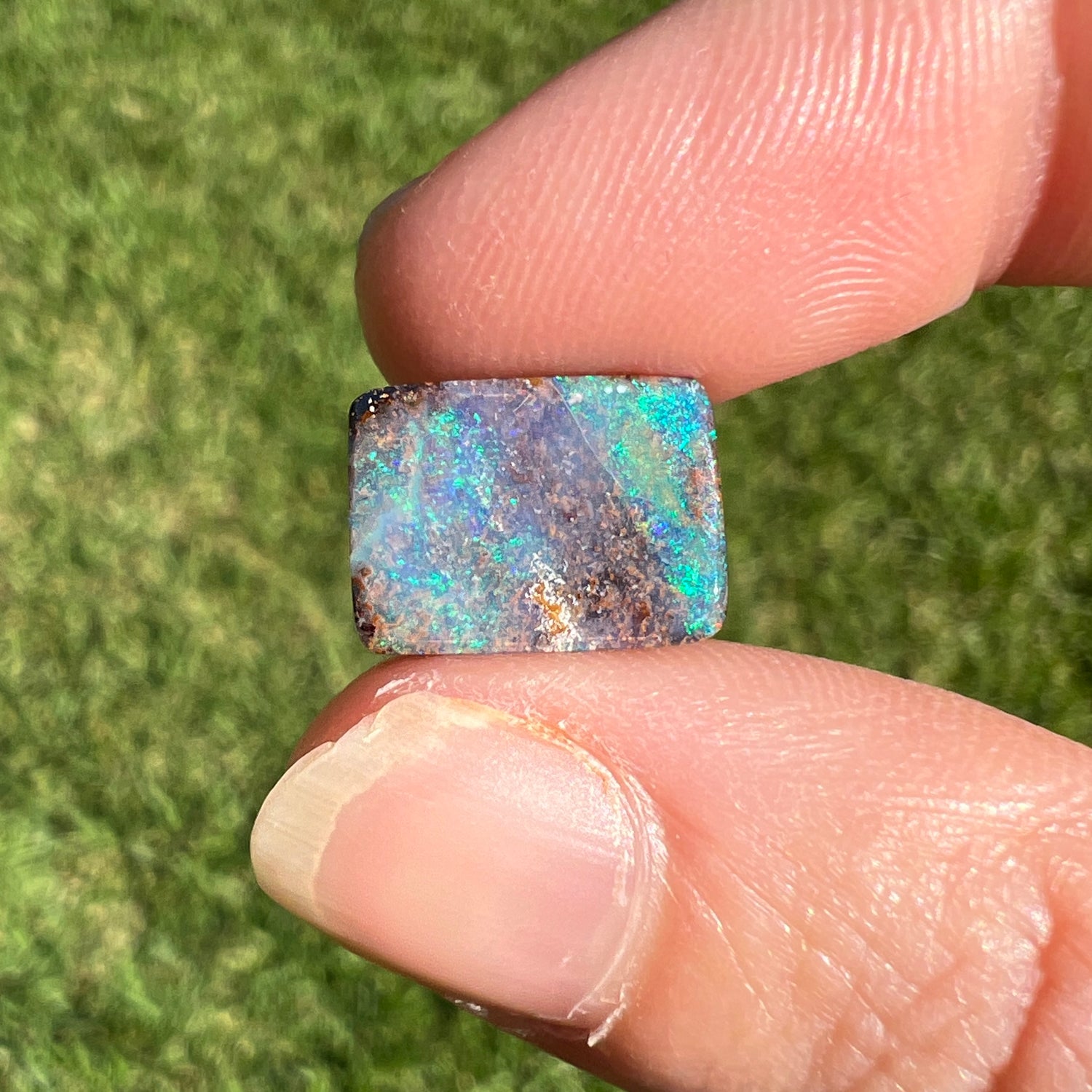 A lovely green and blue rectangle boulder opal.