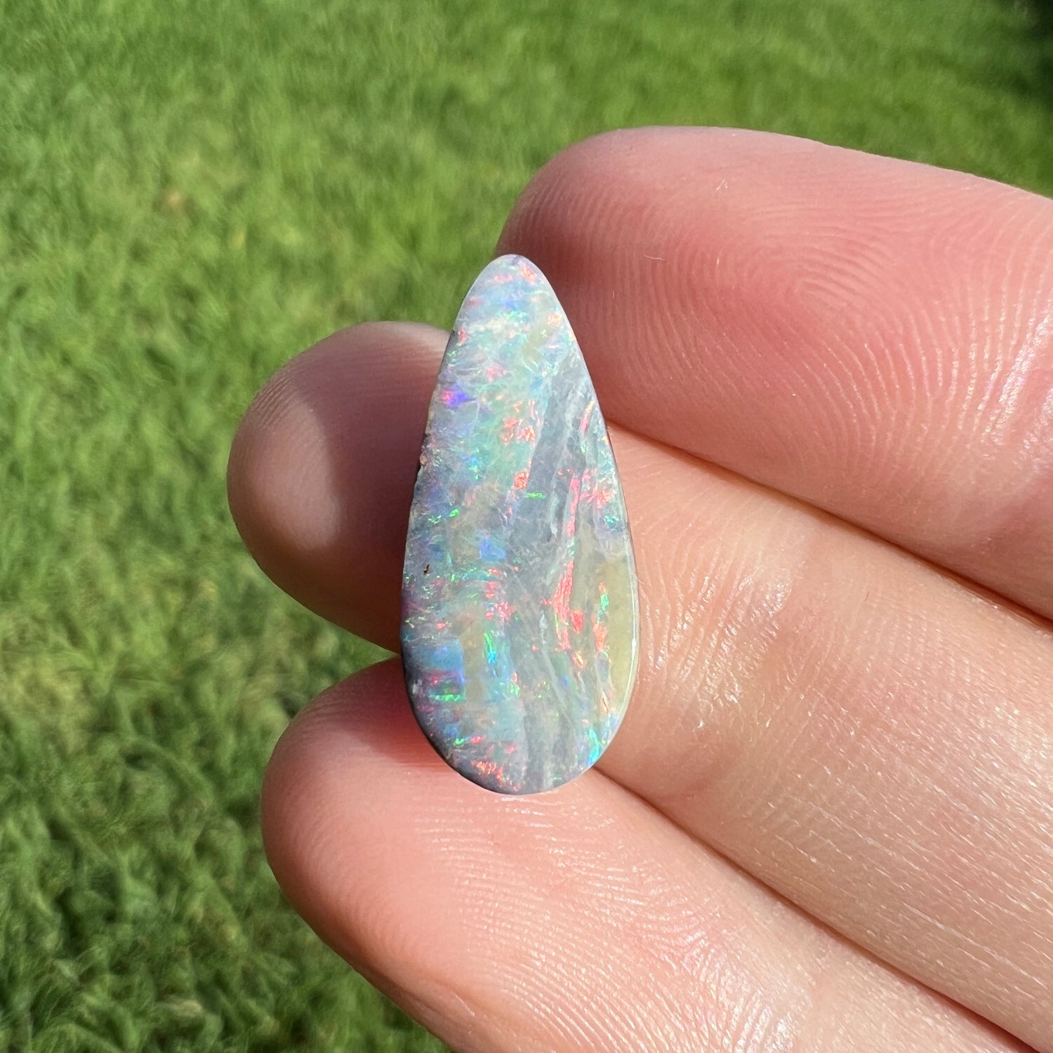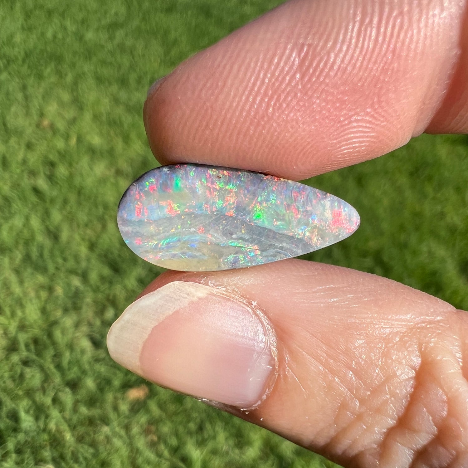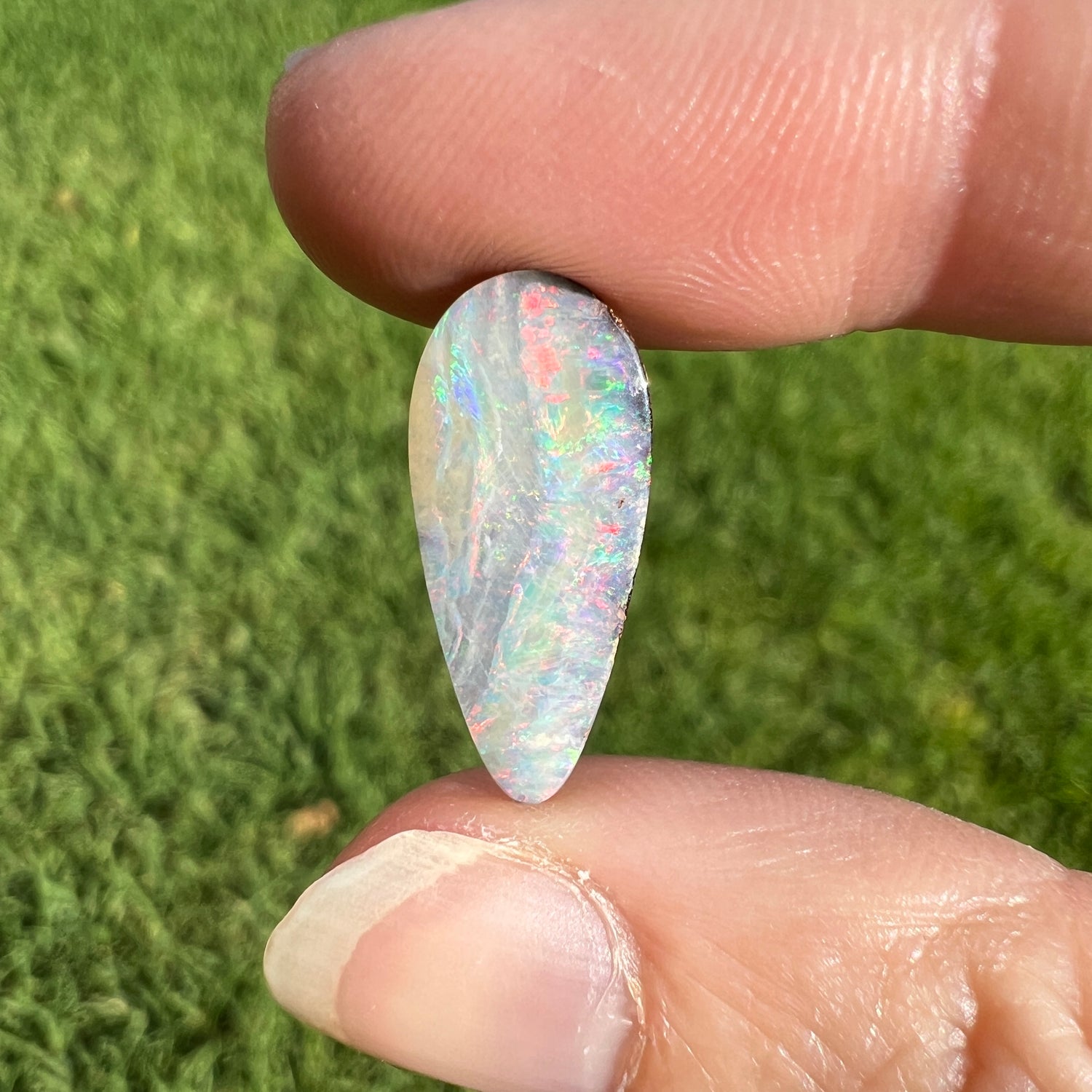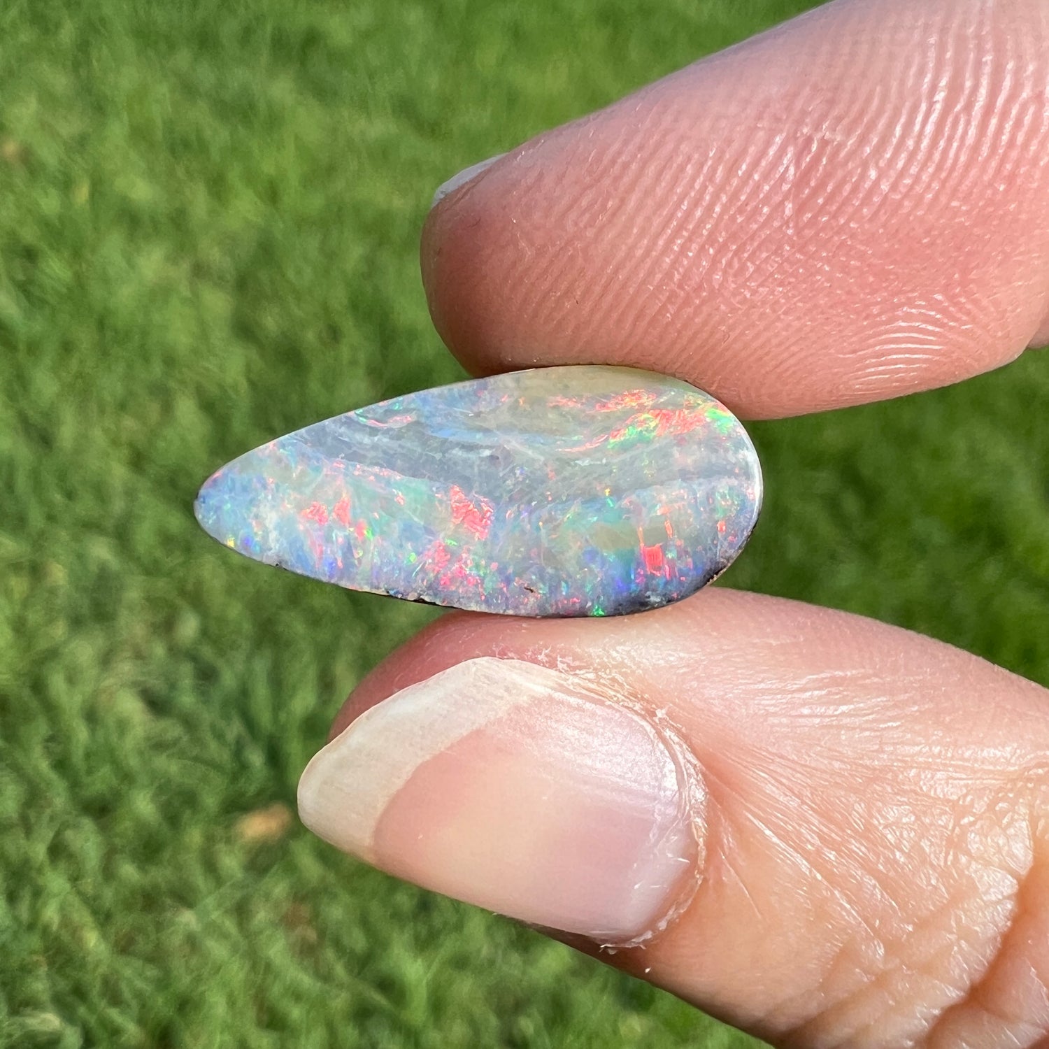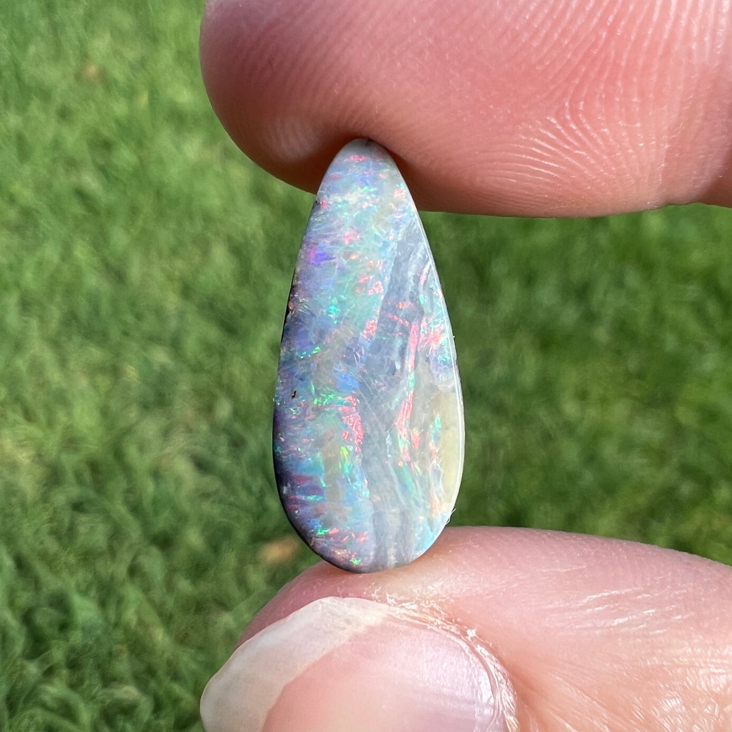 A pretty rainbow boulder opal with a wavy pattern on one side.