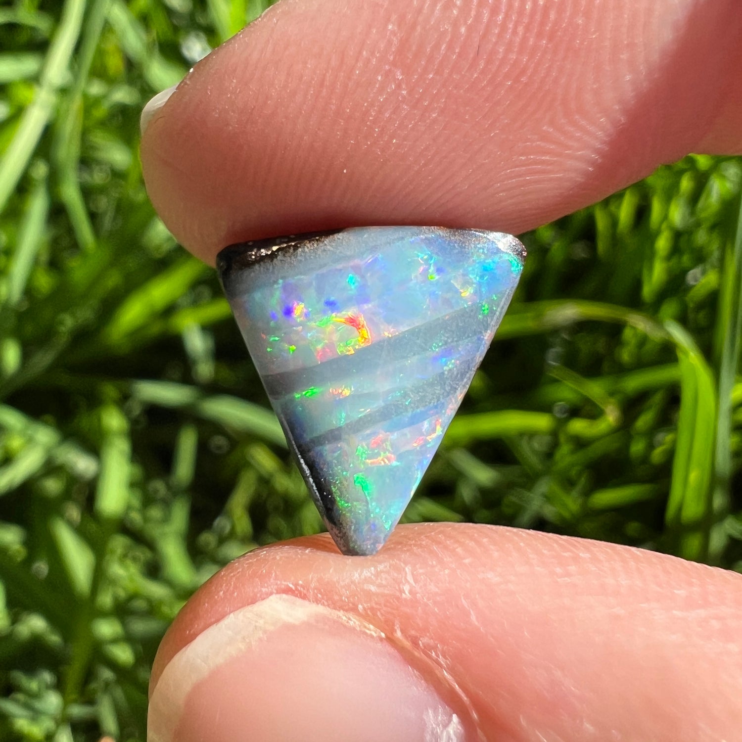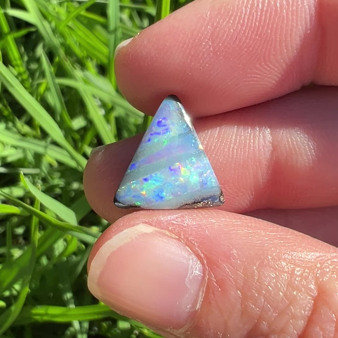 A beautiful 4.47 Ct triangle boulder opal with gem-grade rainbow stripes.
