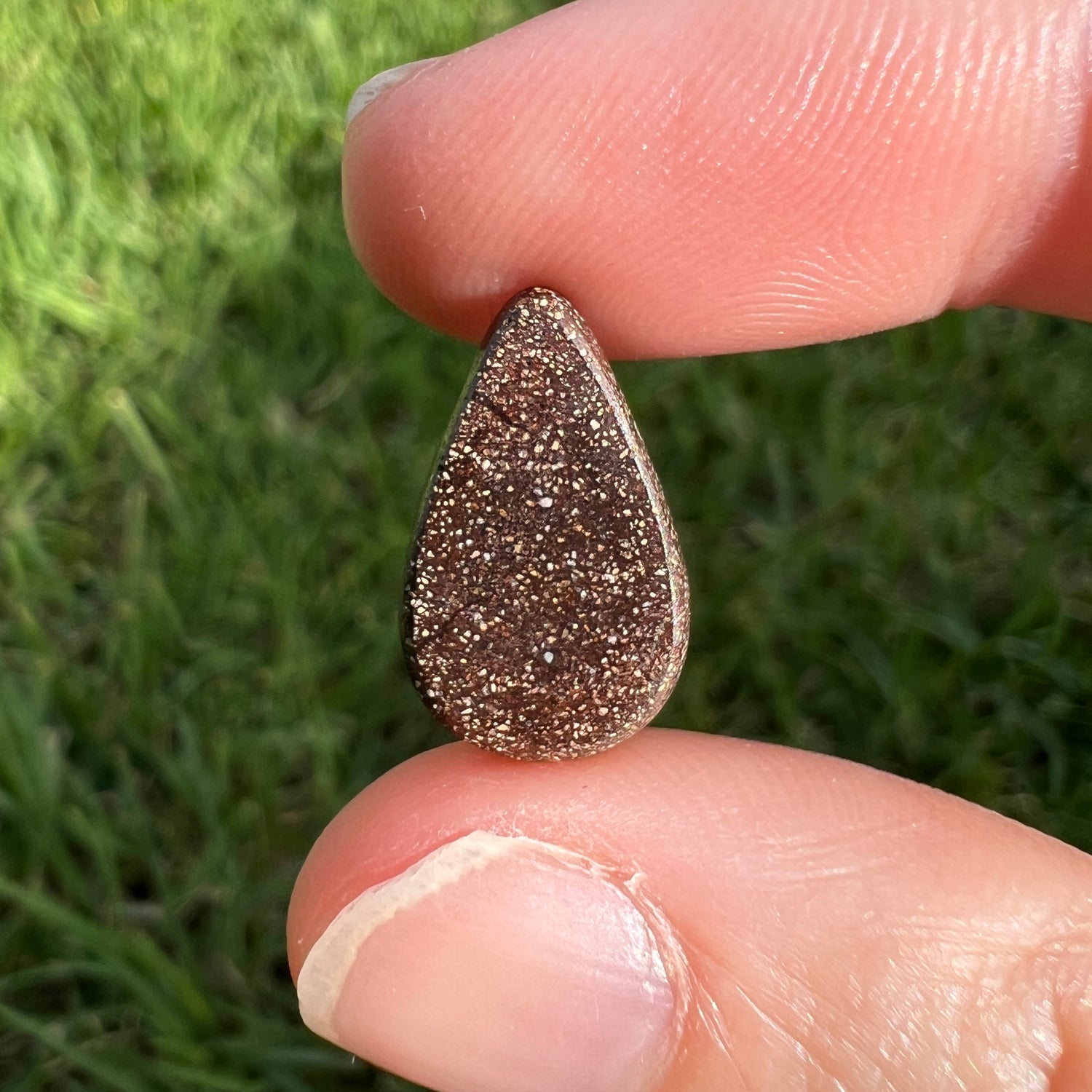A lovely teardrop boulder opal with pink, green and blue colours.