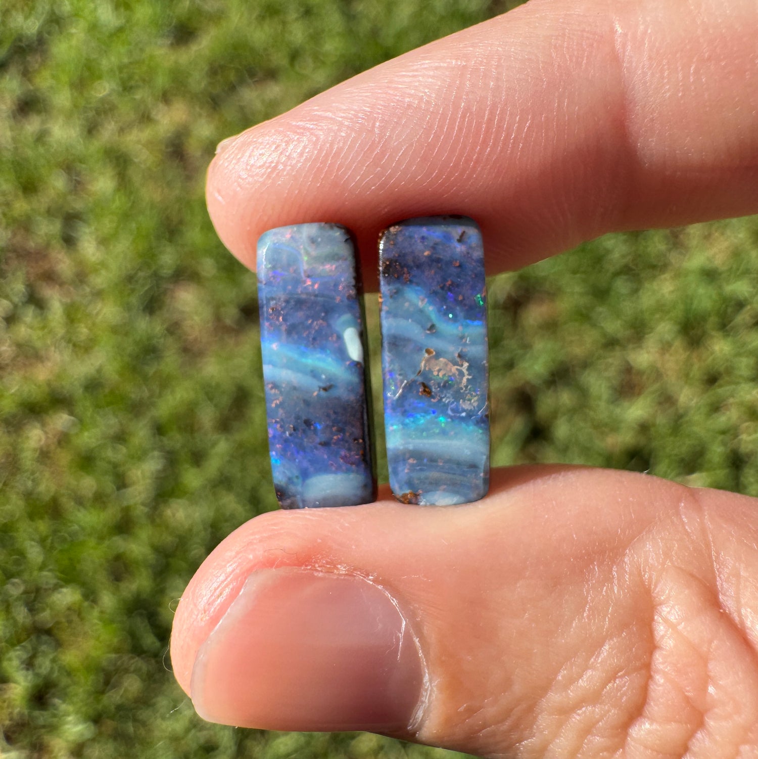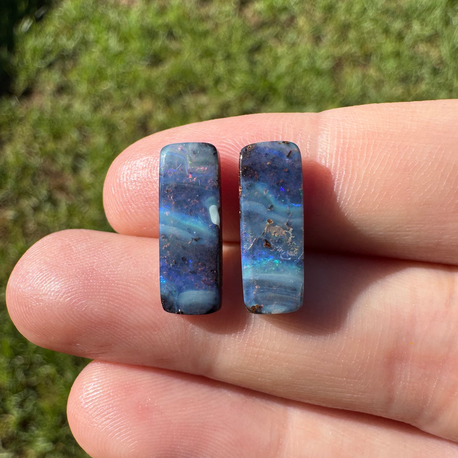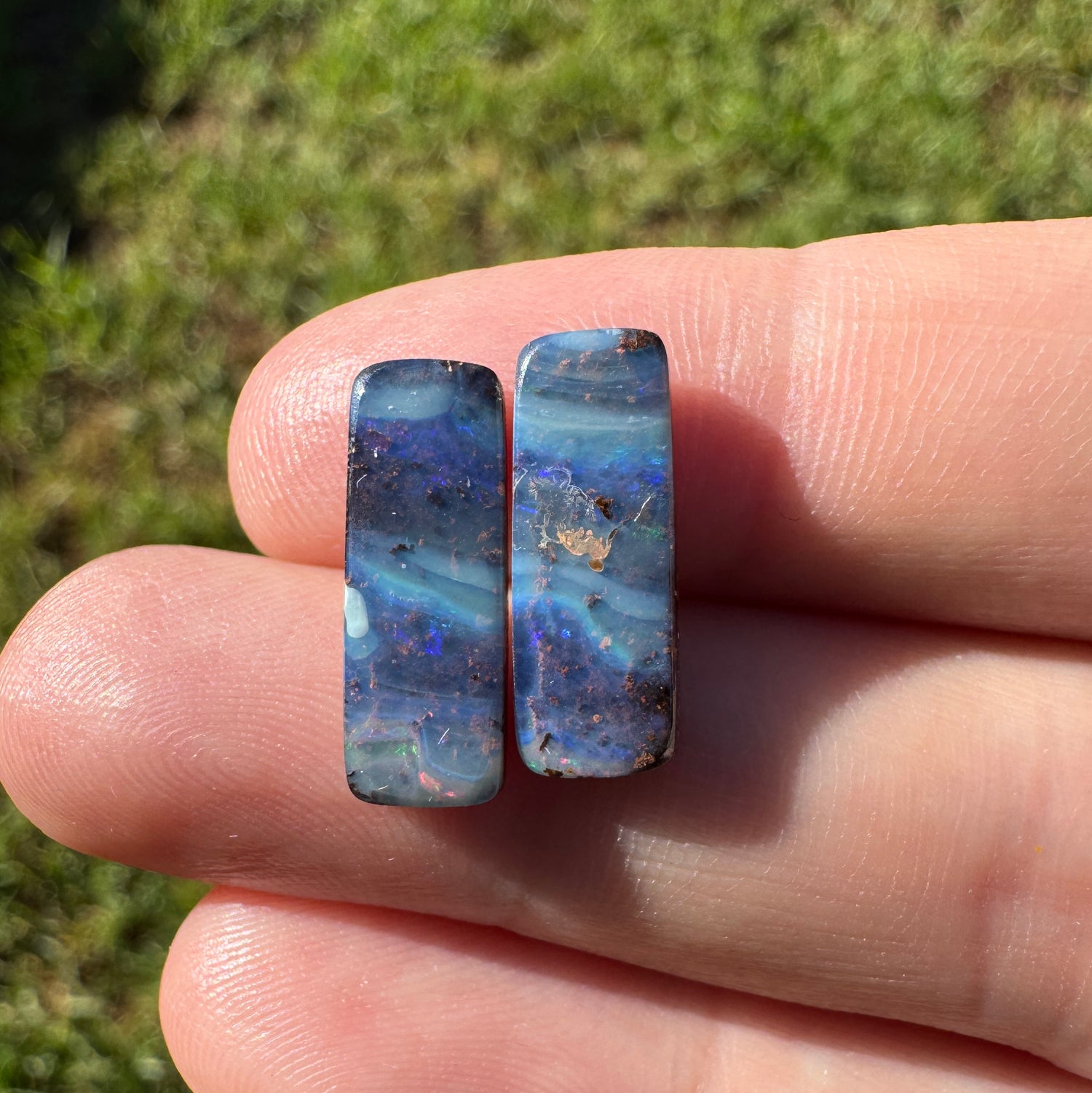 A lovely small rectangle boulder opal pair with green and blue stripes.