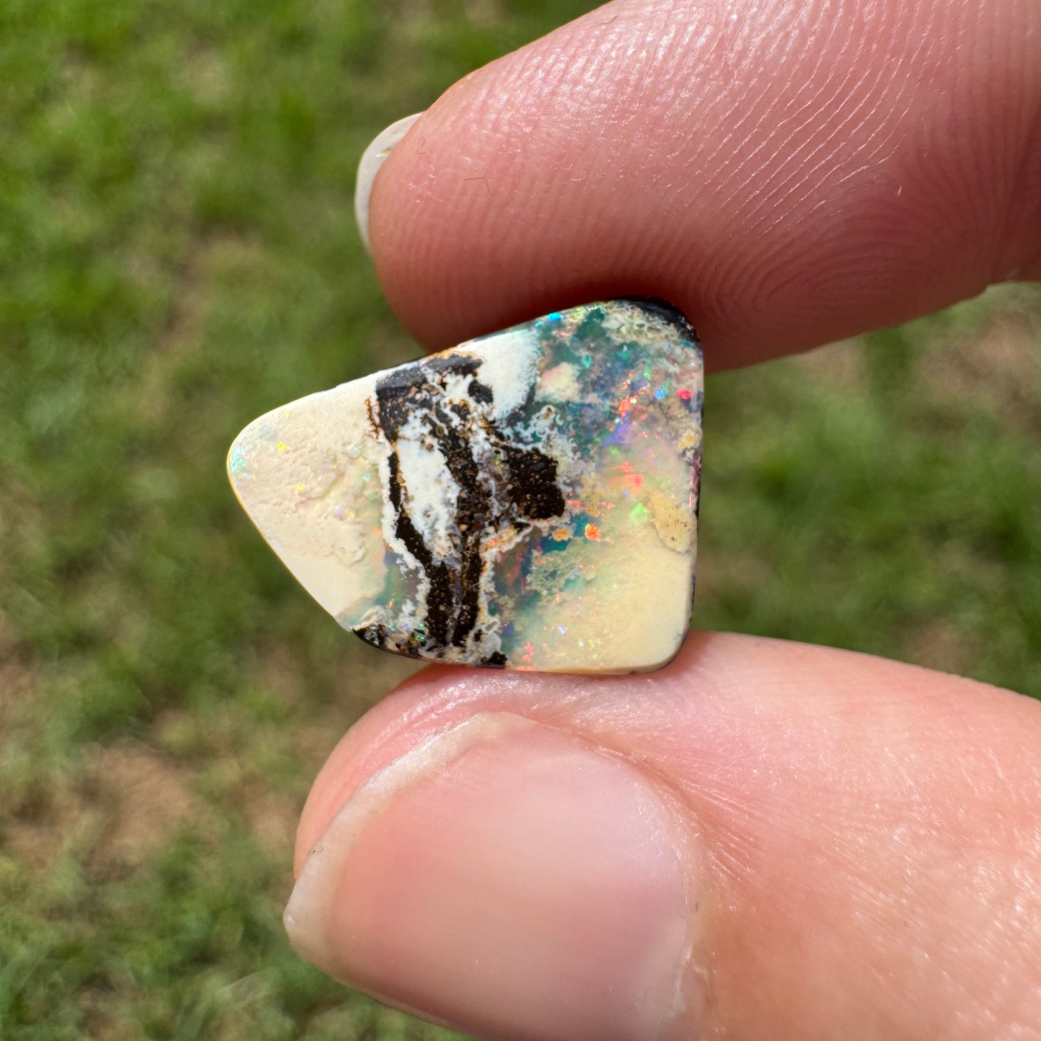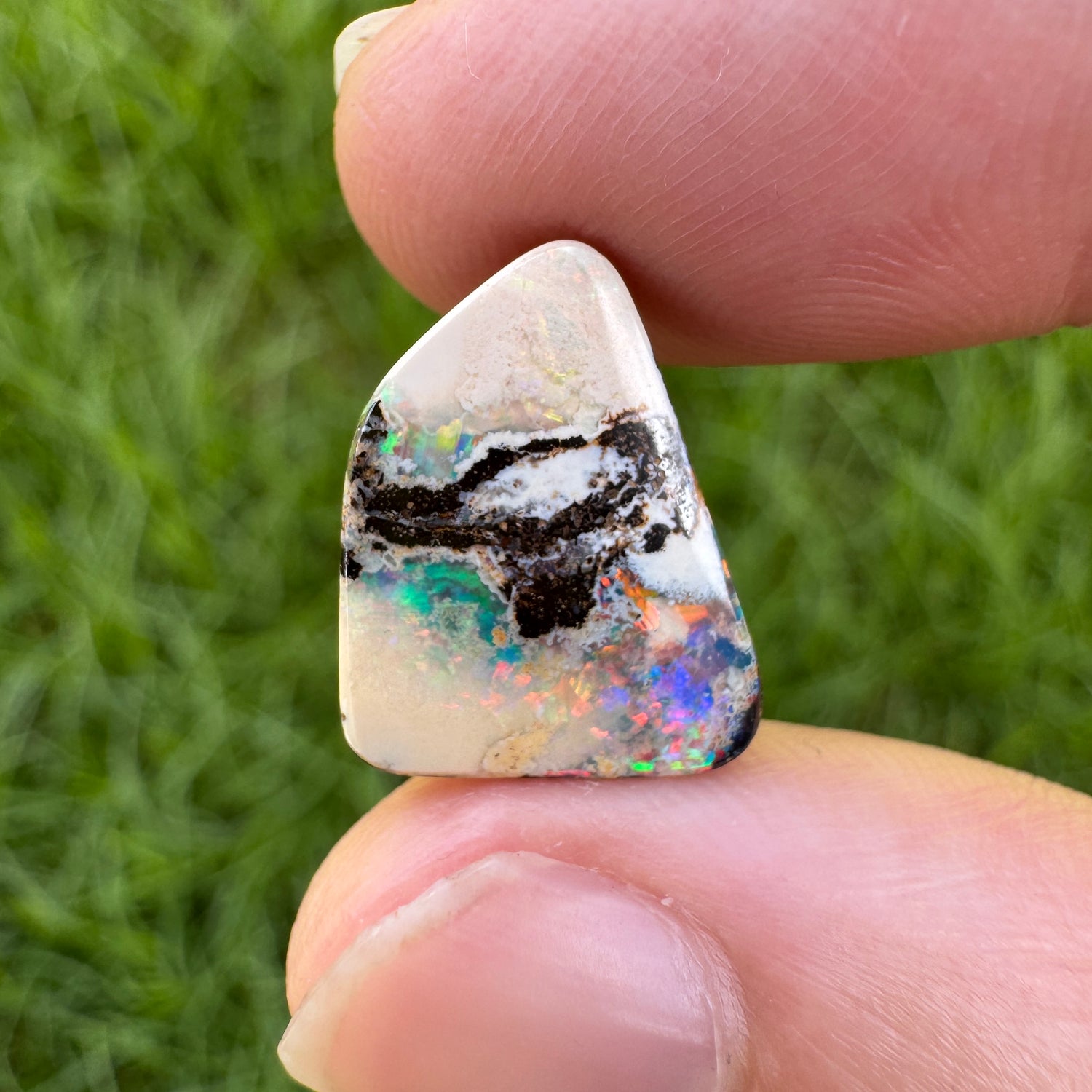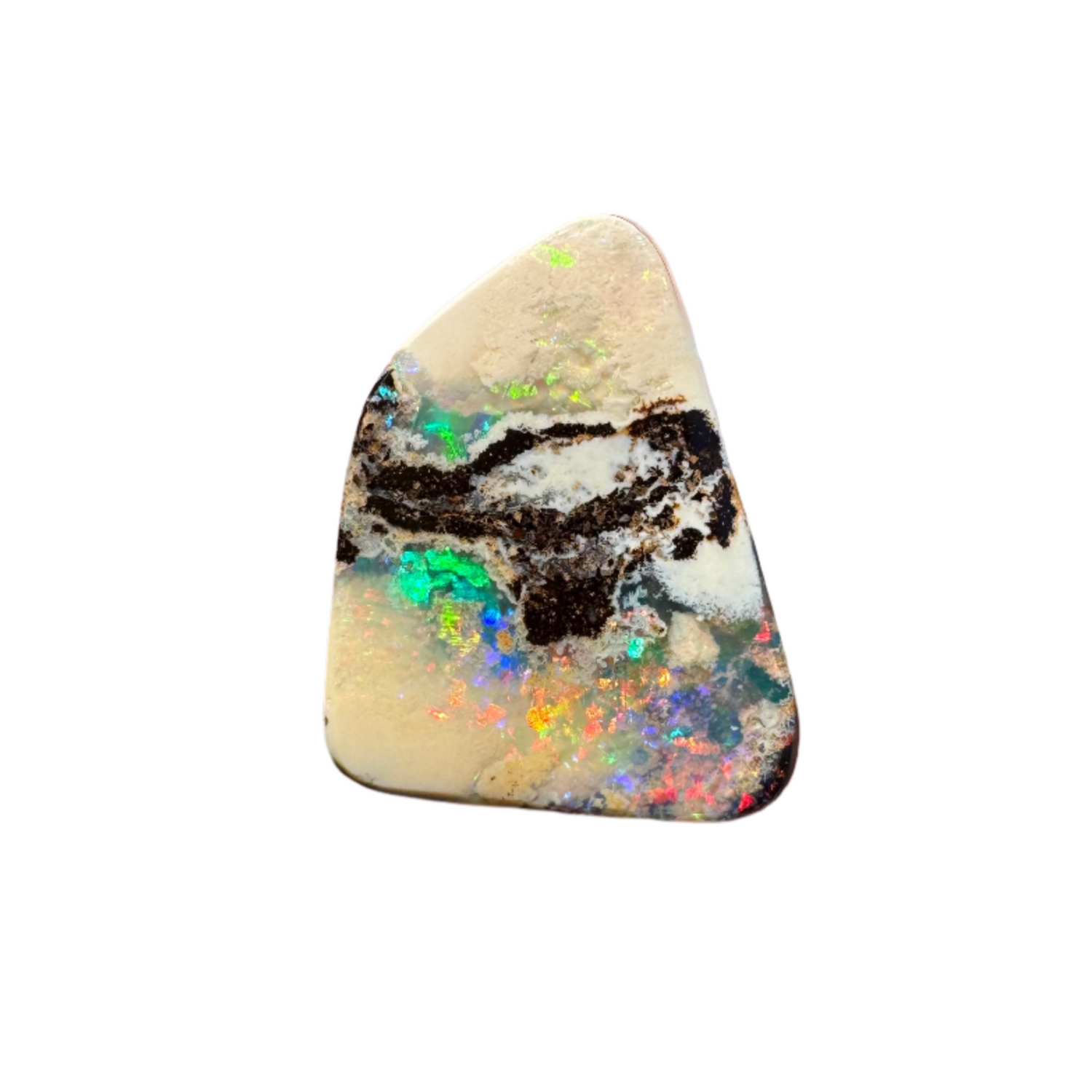 A lovely free-form boulder opal with a rolling rainbow pattern.