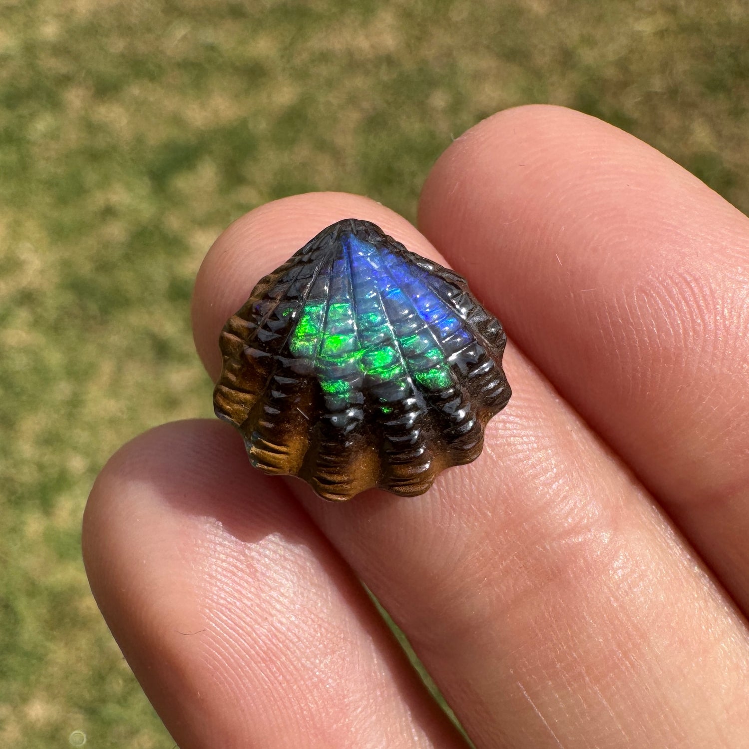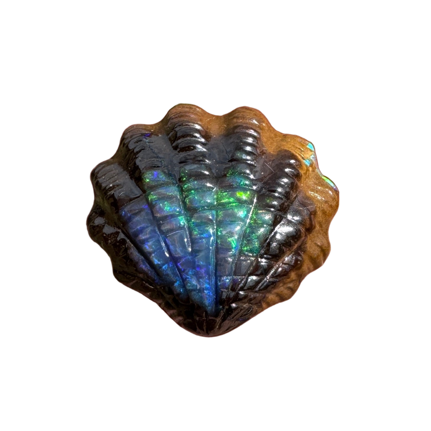 A lovely fan shell boulder opal carving. Please note this is very limited stock, so don't miss out.