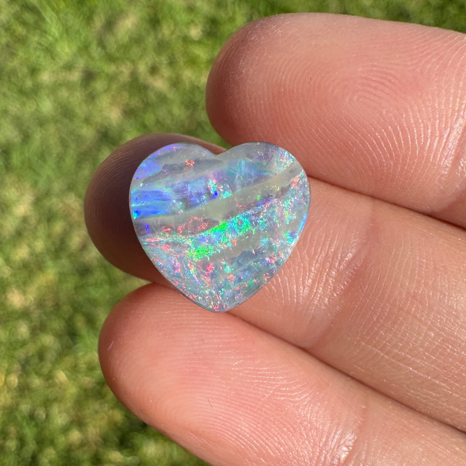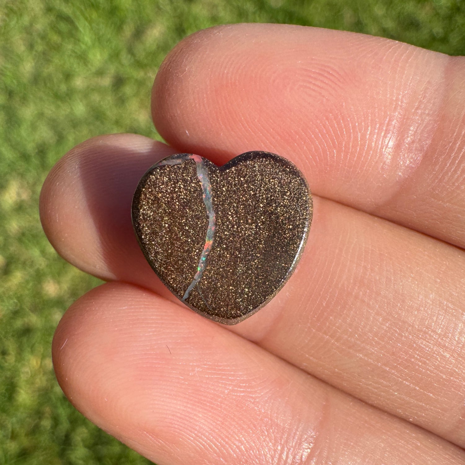 A stunning bright heart-shaped boulder opal with rainbow colours.