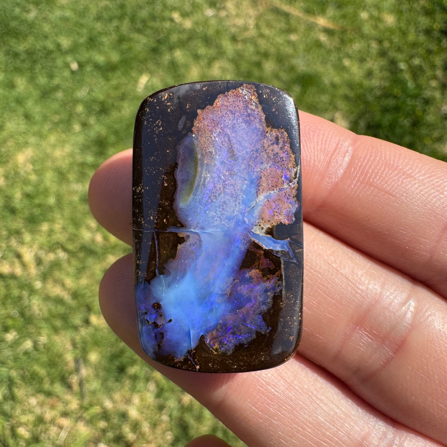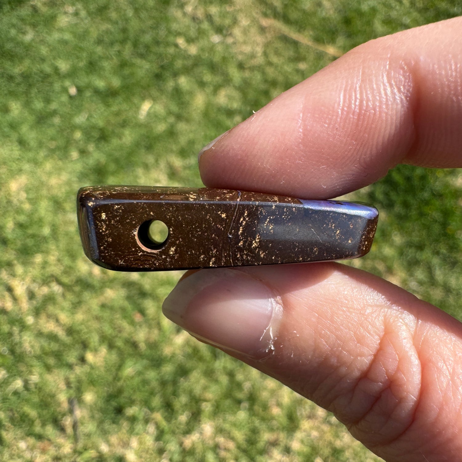 A beautiful large boulder opal that has has a ~2.5 mm drilled hole through its side.