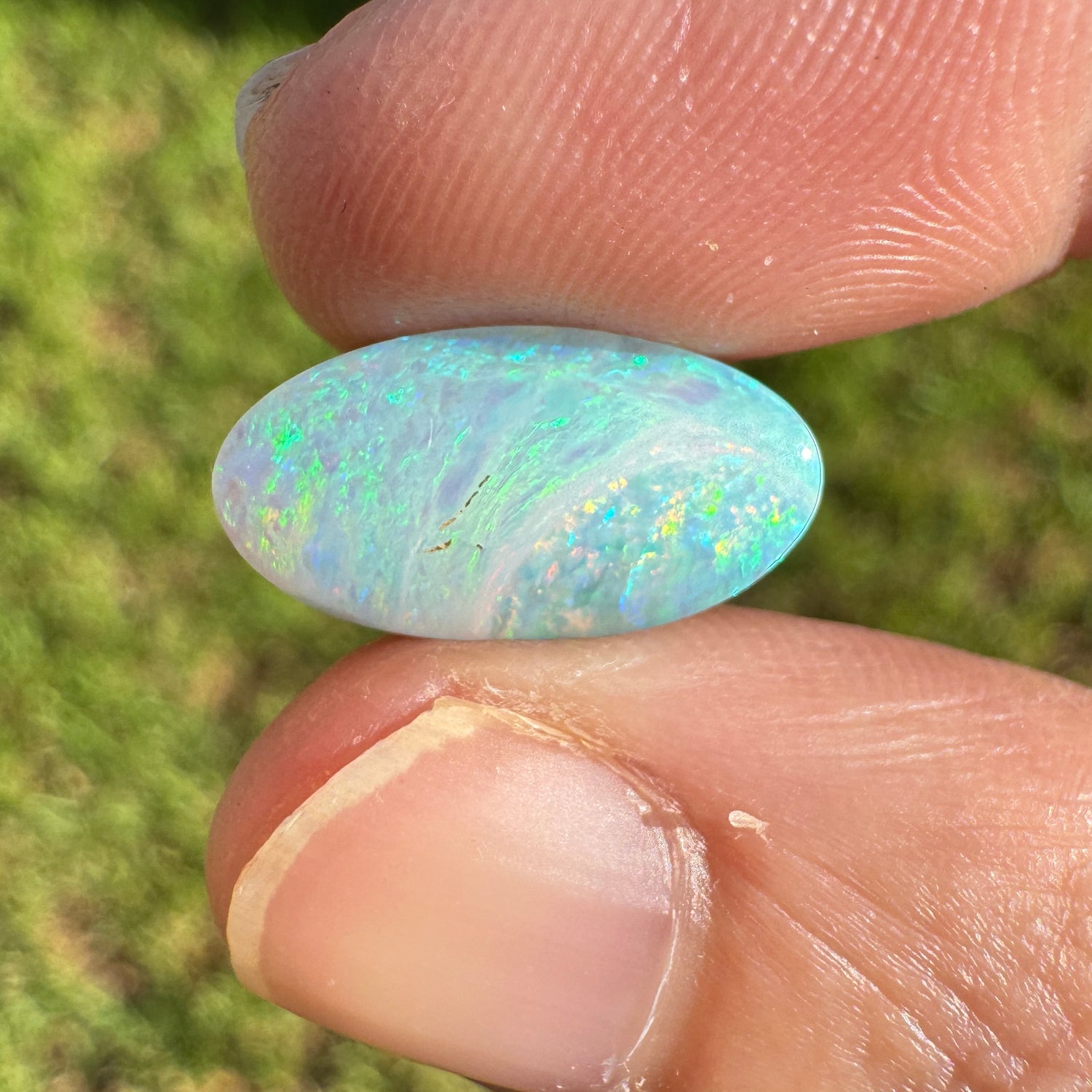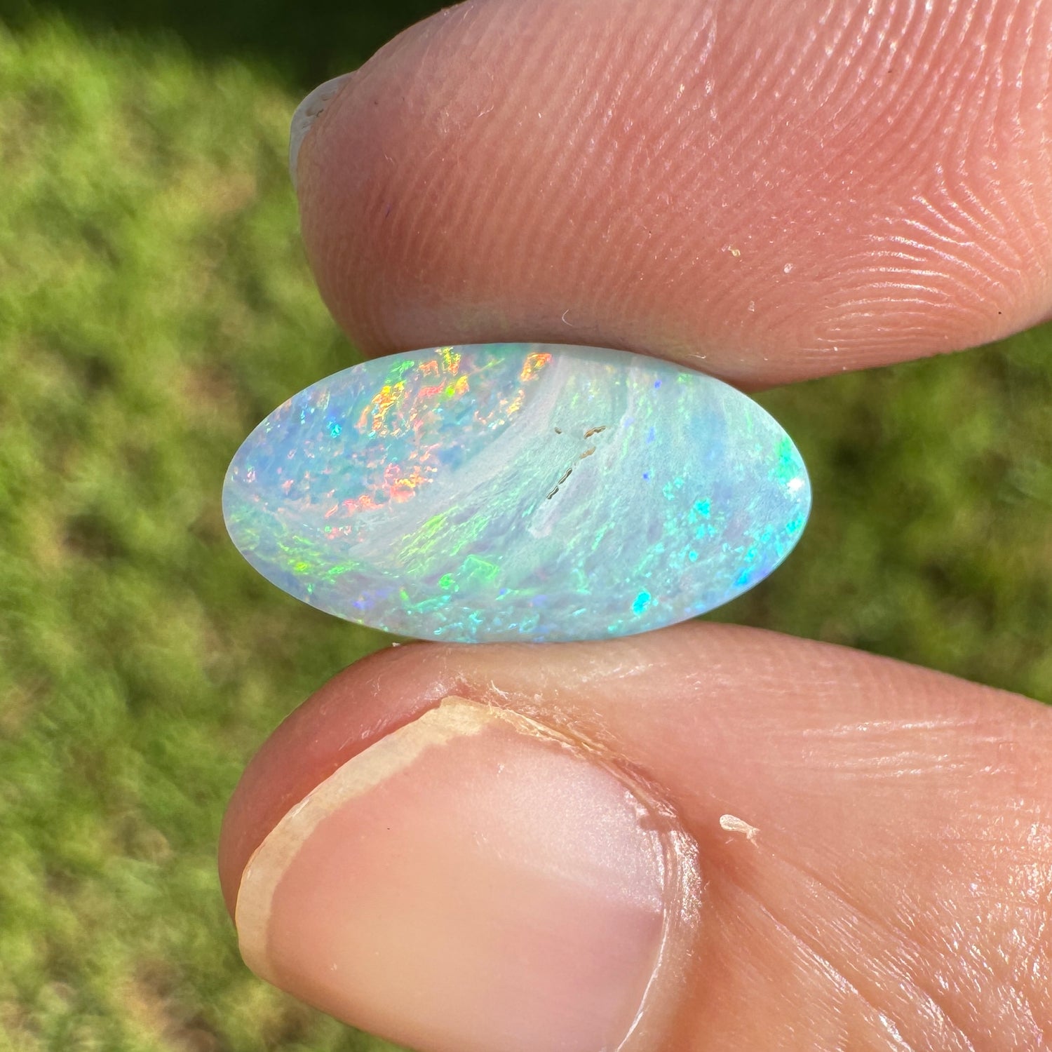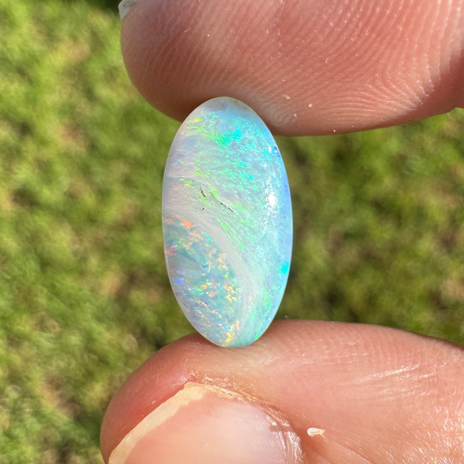 A beautiful pastel oval boulder opal. This piece is an excellent price, given it has a slight imperfection on its face. It pops more on camera, then it does in real life.