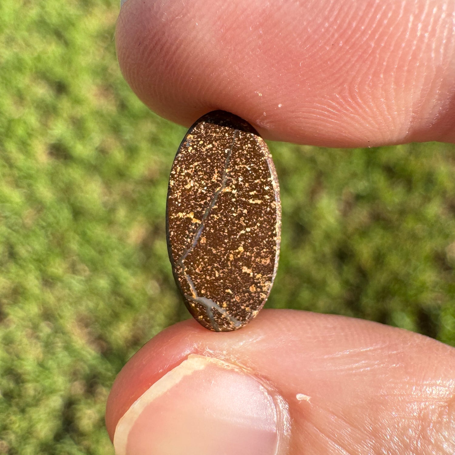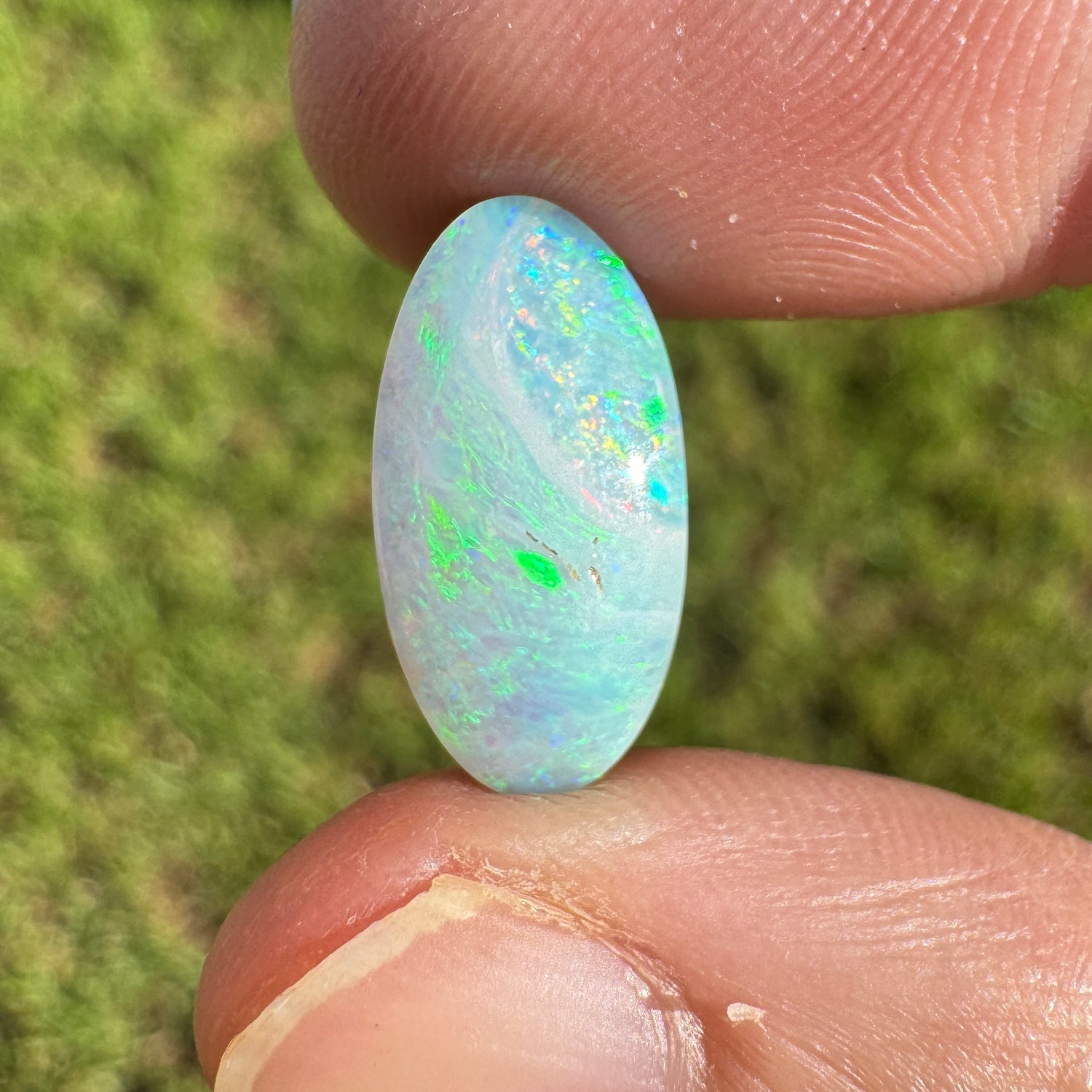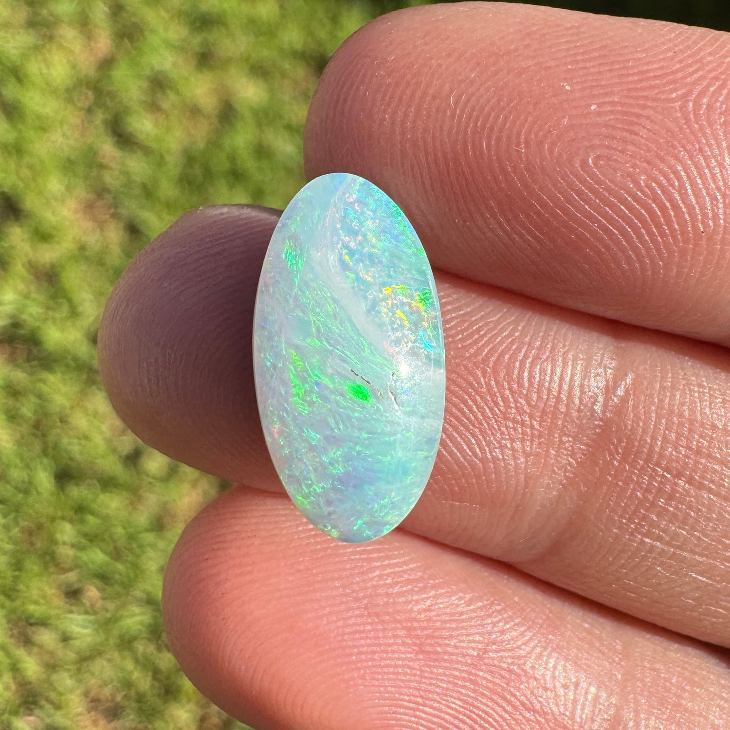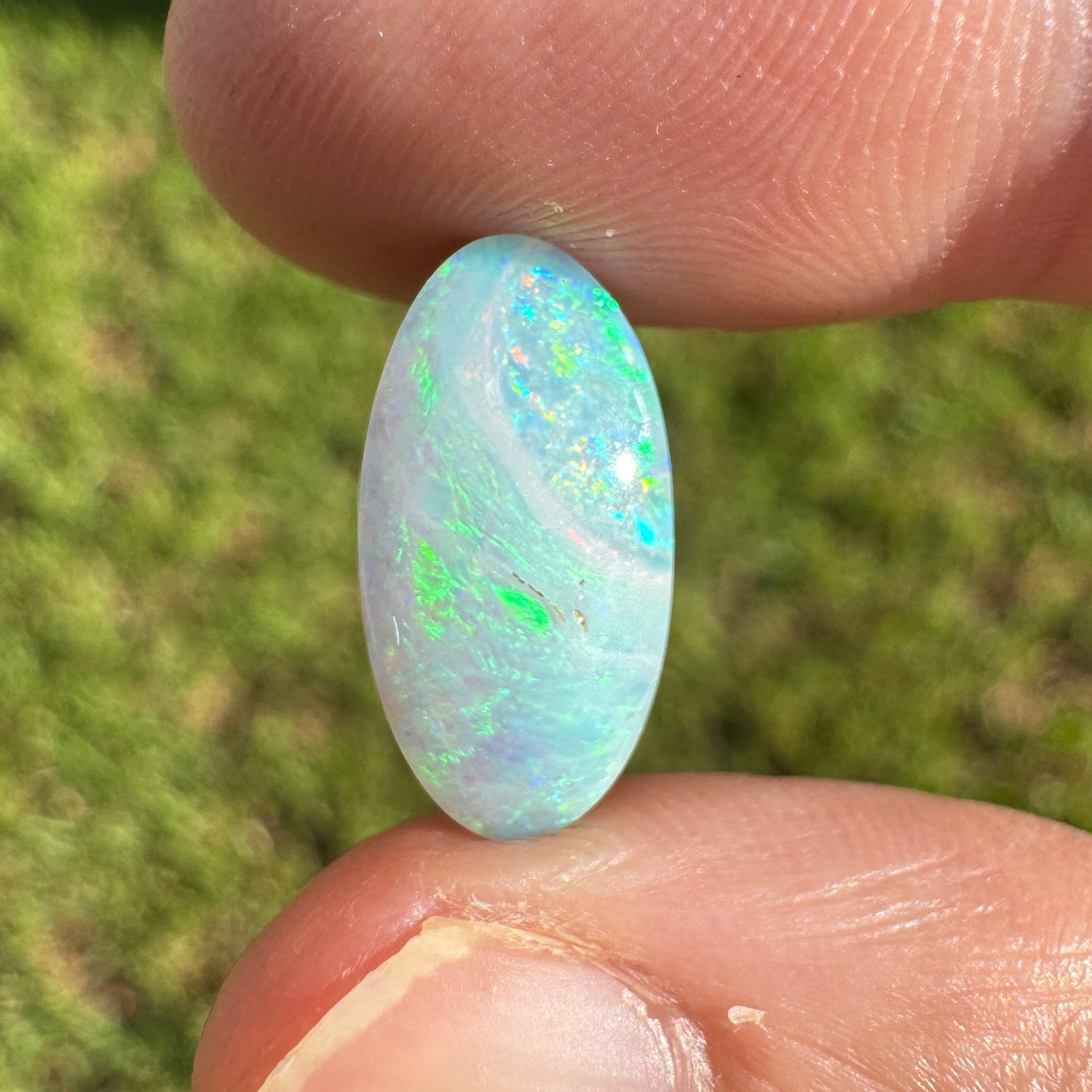 A beautiful pastel oval boulder opal. This piece is an excellent price, given it has a slight imperfection on its face. It pops more on camera, then it does in real life.